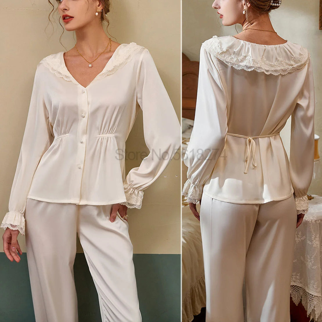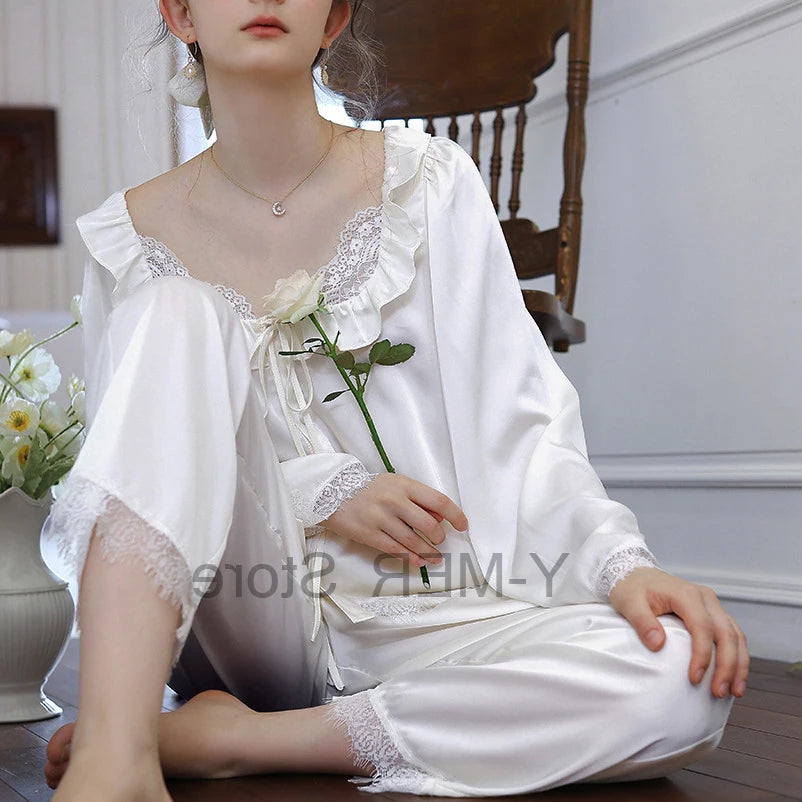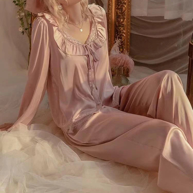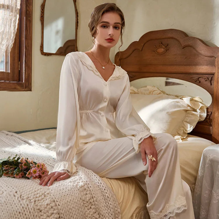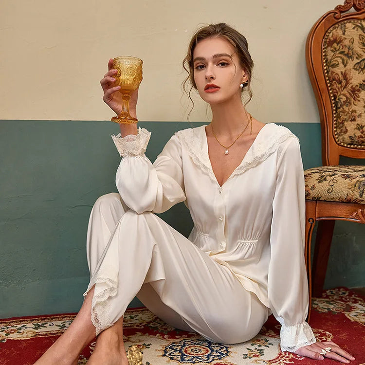 פיג'מת סאטן לנשים בסגנון וינטג' מלכותי – עם תחרה וכפתורים