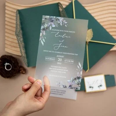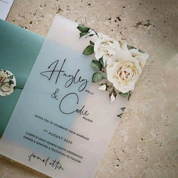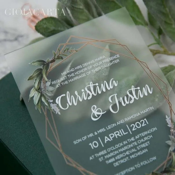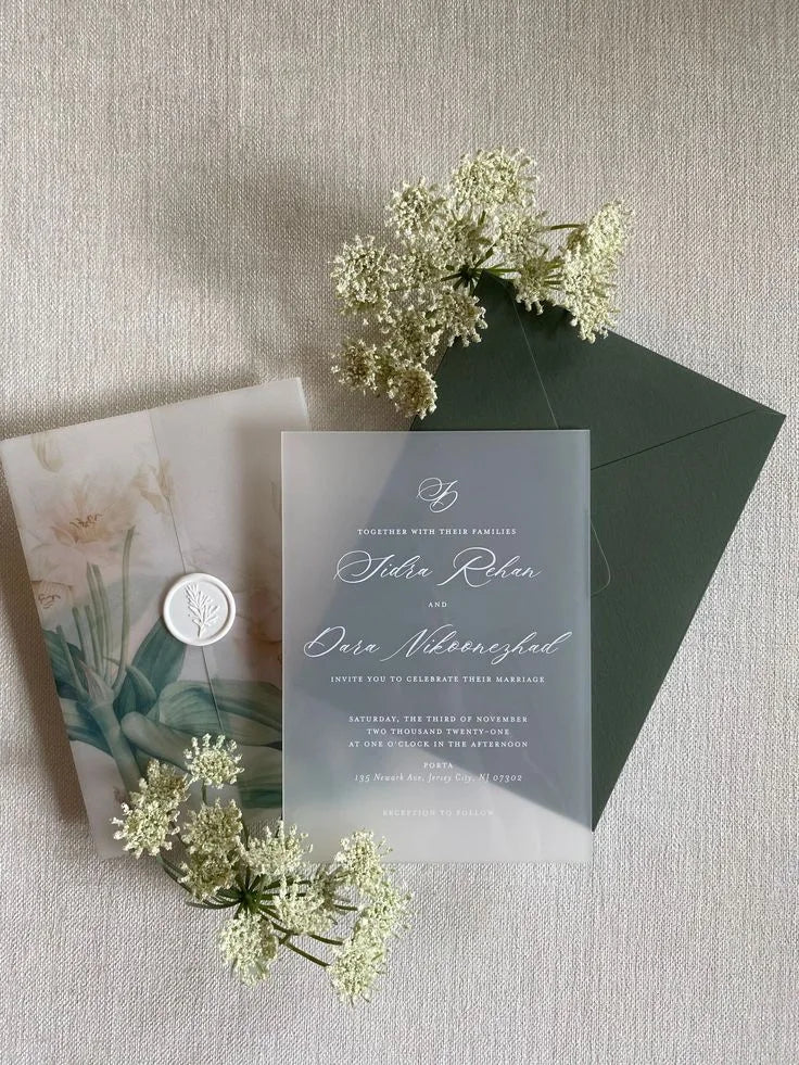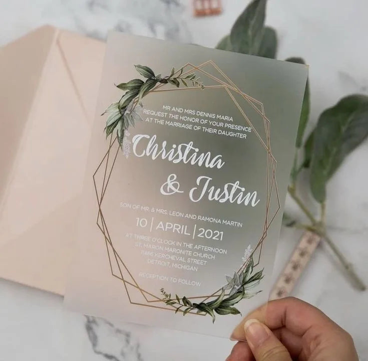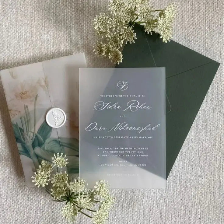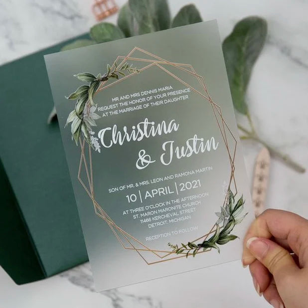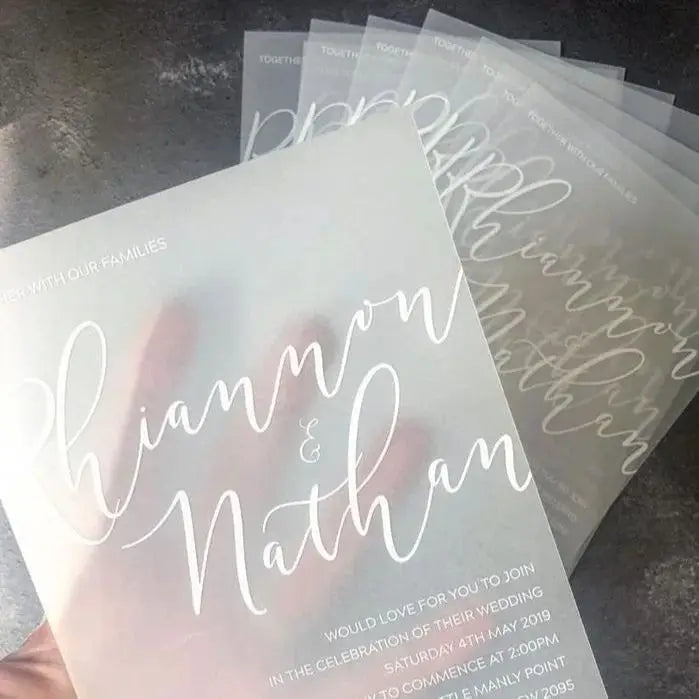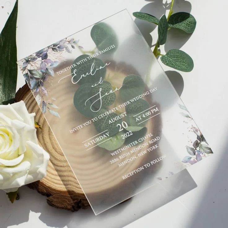הזמנה שקופה עם הדפס לבן – עיצוב יוקרתי וייחודי על גבי אקריל חלבי